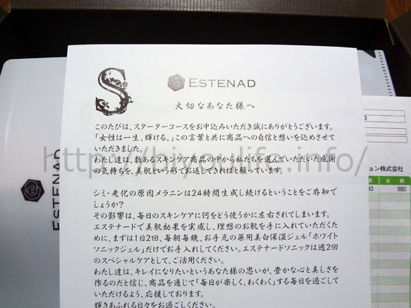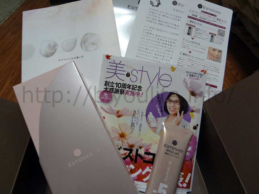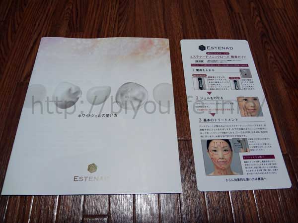 左からホワイトソニックジェル、エステナードソニックの簡単ガイド、ホワイトジェルの使い方説明書、