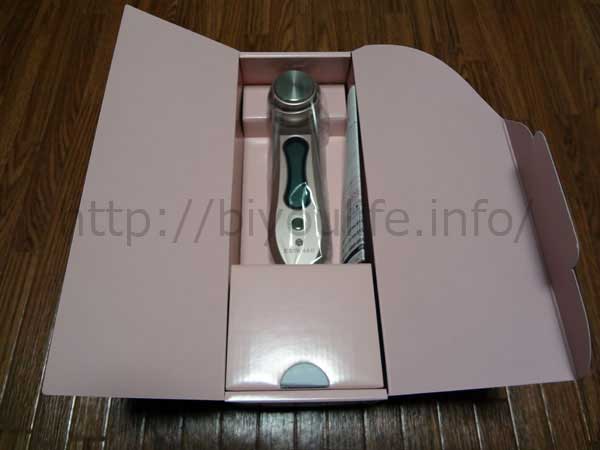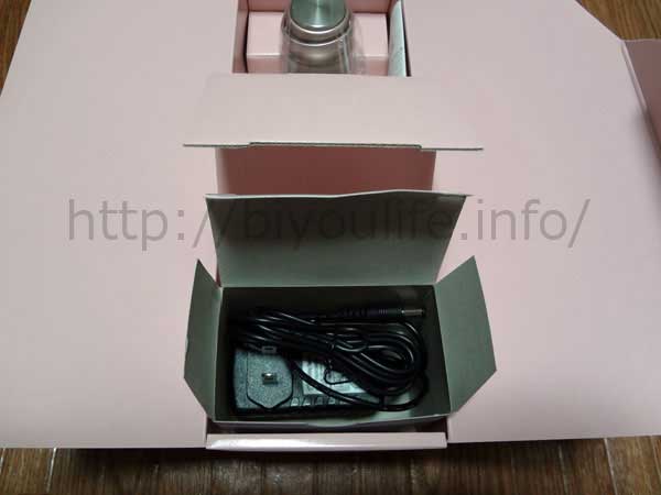 下の小箱を開けるとアダプターが入っています。エステナードソニックローズ(ROSE)は、従来の乾電池での使用以外にも、アダプターをコンセントにさして使うことも出来ちゃいます。エステナードソニックmomoは乾電池でしか使えません。